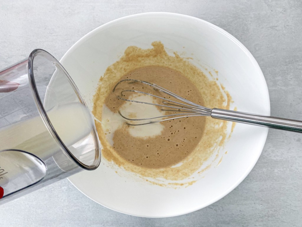 2. Am adăugat 1/2 din cantitatea de lapte și făina de ovăz. Se amestecă bine până când se obține un aluat omogen.