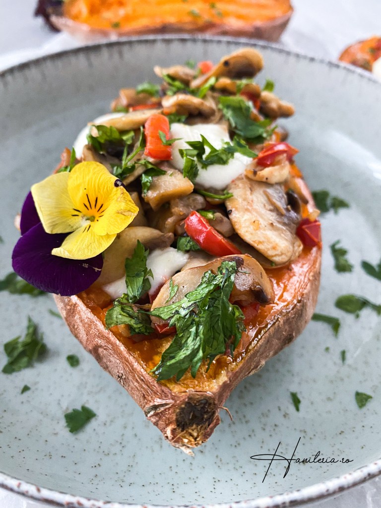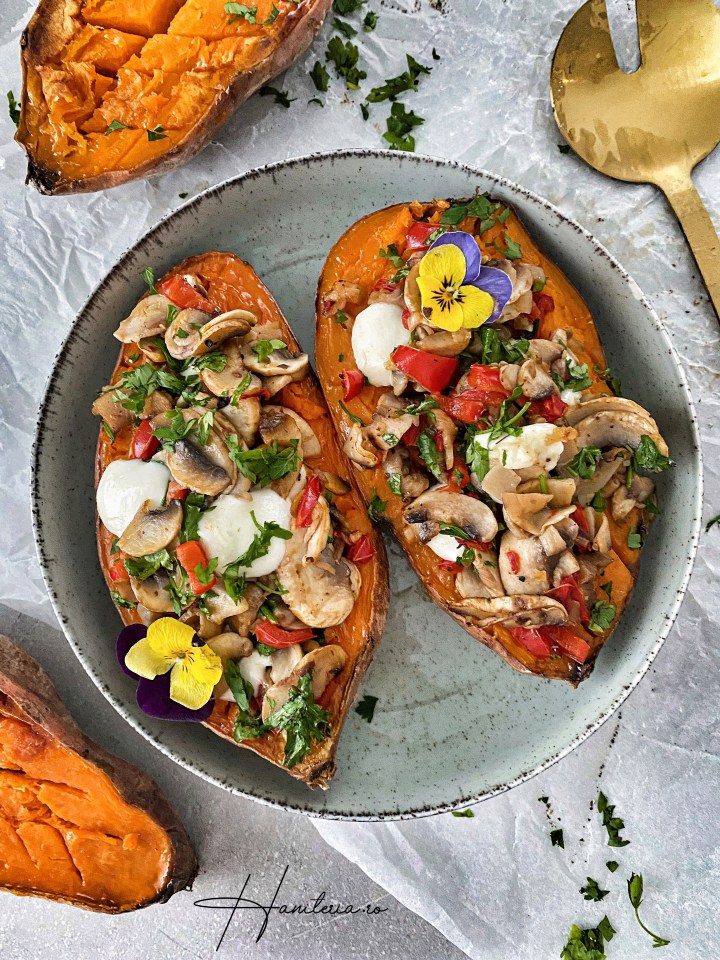 Deși cartoful clasic rămâne pentru mine favorit, am început să consum tot mai des și cartof dulce. Inițial nu m-a dat pe spate foarte tare, pentru că mi se părea că seamănă la gust cu dovleacul, care mie nu îmi place foarte mult. Însă, varianta asta de cartof dulce umplut cu ciuperci și mozzarella m-a cucerit. Mai mult, am început să coc mai mulți cartofi dulci deodată și îi păstrez copți la frigider. La nevoie, scot câte un cartof dulce de la frigider, îl umplu și îl reintroduc la cuptor pentru aproximativ 10 minute ca să se reîncălzească . Mie mi se pare foarte utilă ideea ca meal prep. Gustul cartofilor dulci se păstrează destul de bine și a doua zi, ca atunci când sunt prospeți scoși din cuptor.