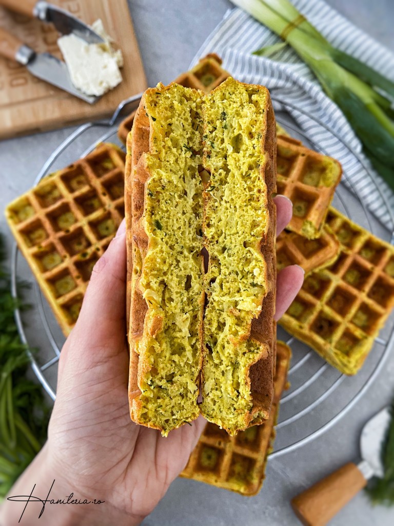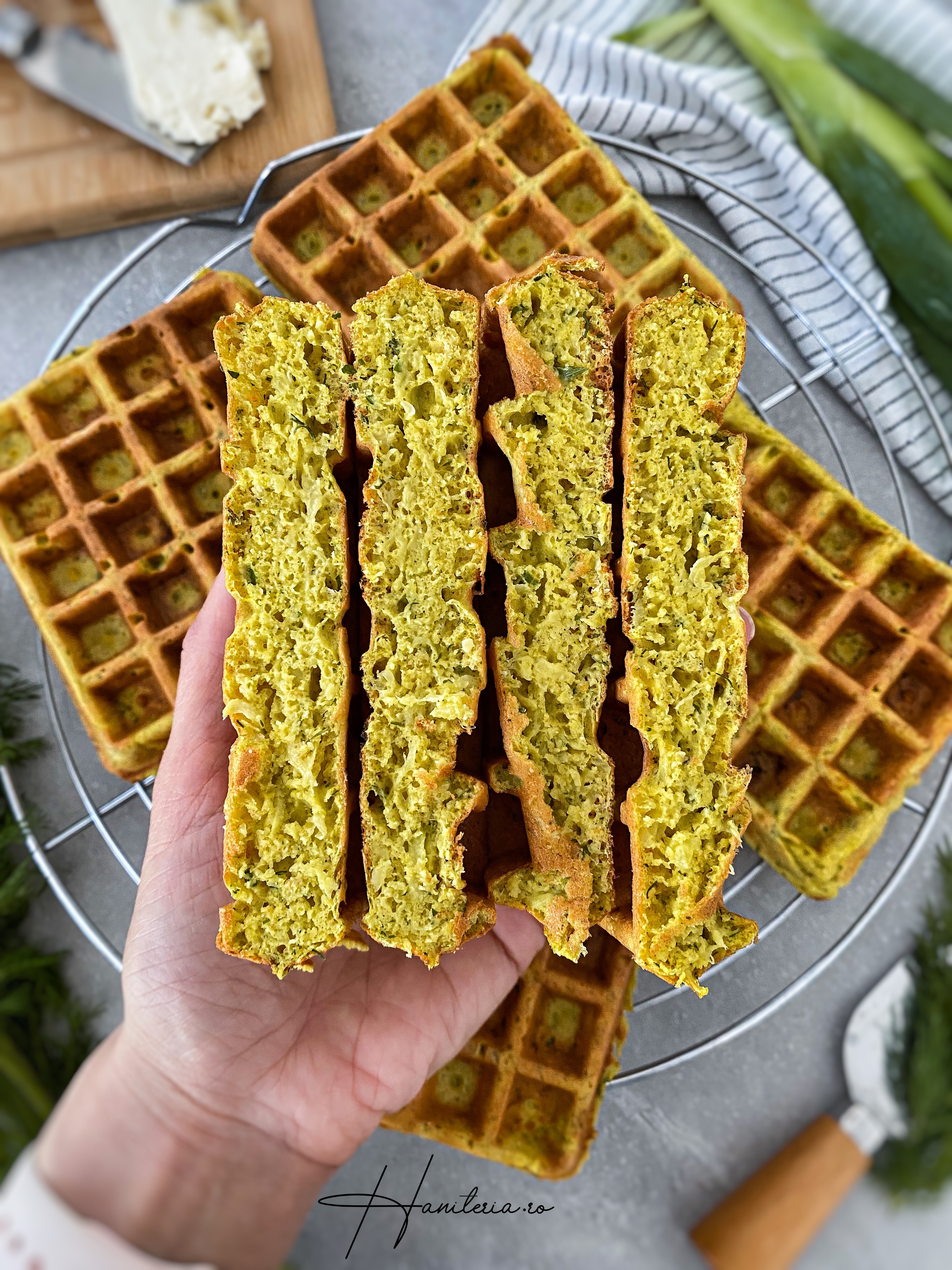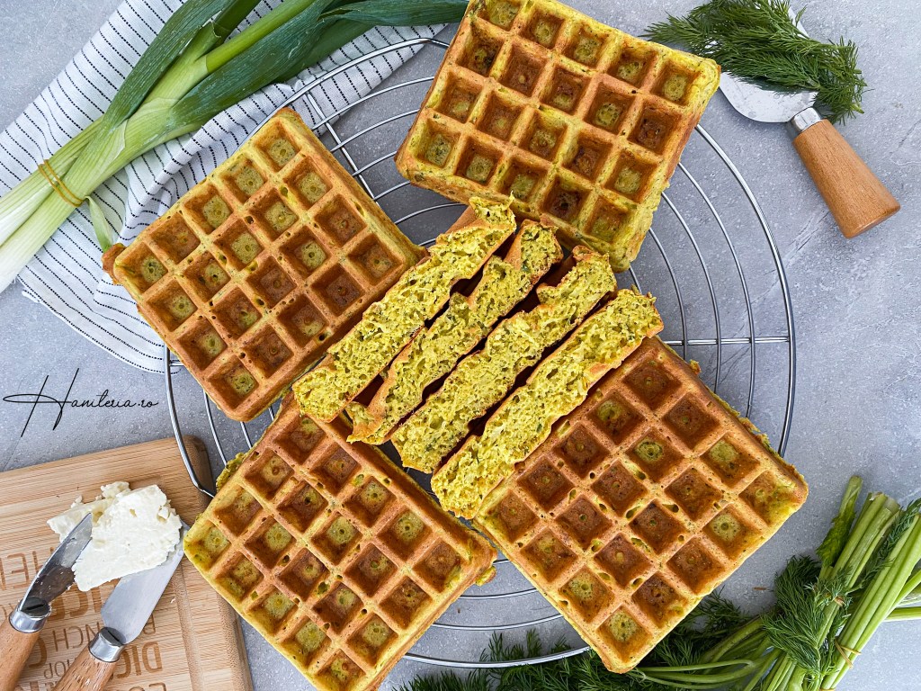 De când am luat aparatul de vafe am încercat tot felul de rețete, pe blog prezentând deja două variante de gofre dulci. De atunci tot testez și variante sărate, iar aceasta de azi e cea câștigătoare. Nu că a ieșit bună, a ieșit peste așteptări de delicoasă. Combinația dovlecel – brânză/ lactate – mărar – făină năut este MI-NU-NA-TĂ, cel puțin pentru papilele mele gustative.