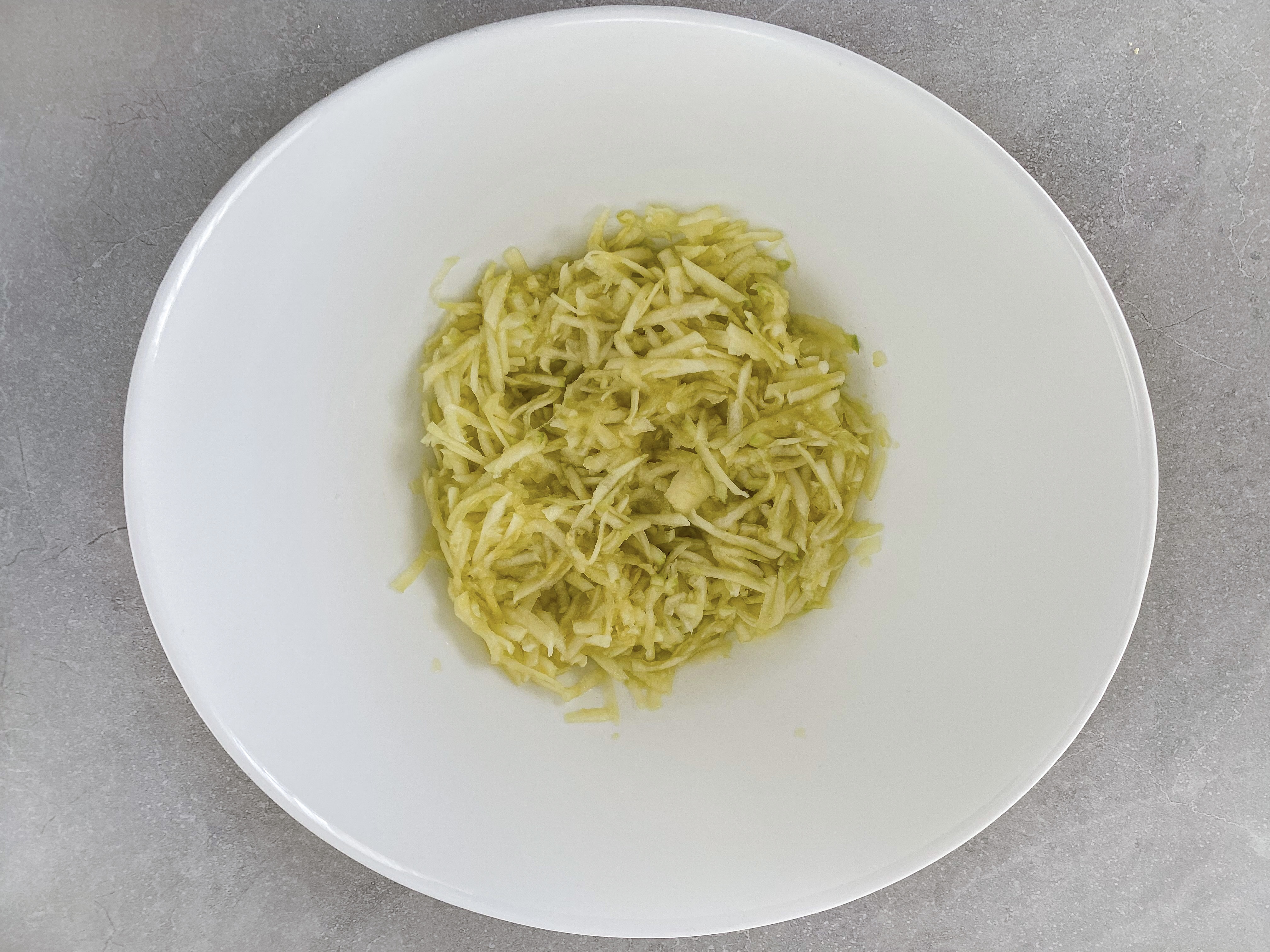 1. Radem dovlecelul, îl presărăm cu un praf bun de sare și îl lăsăm la odihnit pentru aproximativ 10 -15 minute. După ce timpul a expirat, punem dovlecelul într-un tifon (eu am folosit un săculeț pentru legume) și îl scurgem cât de bine putem de toată zeama.