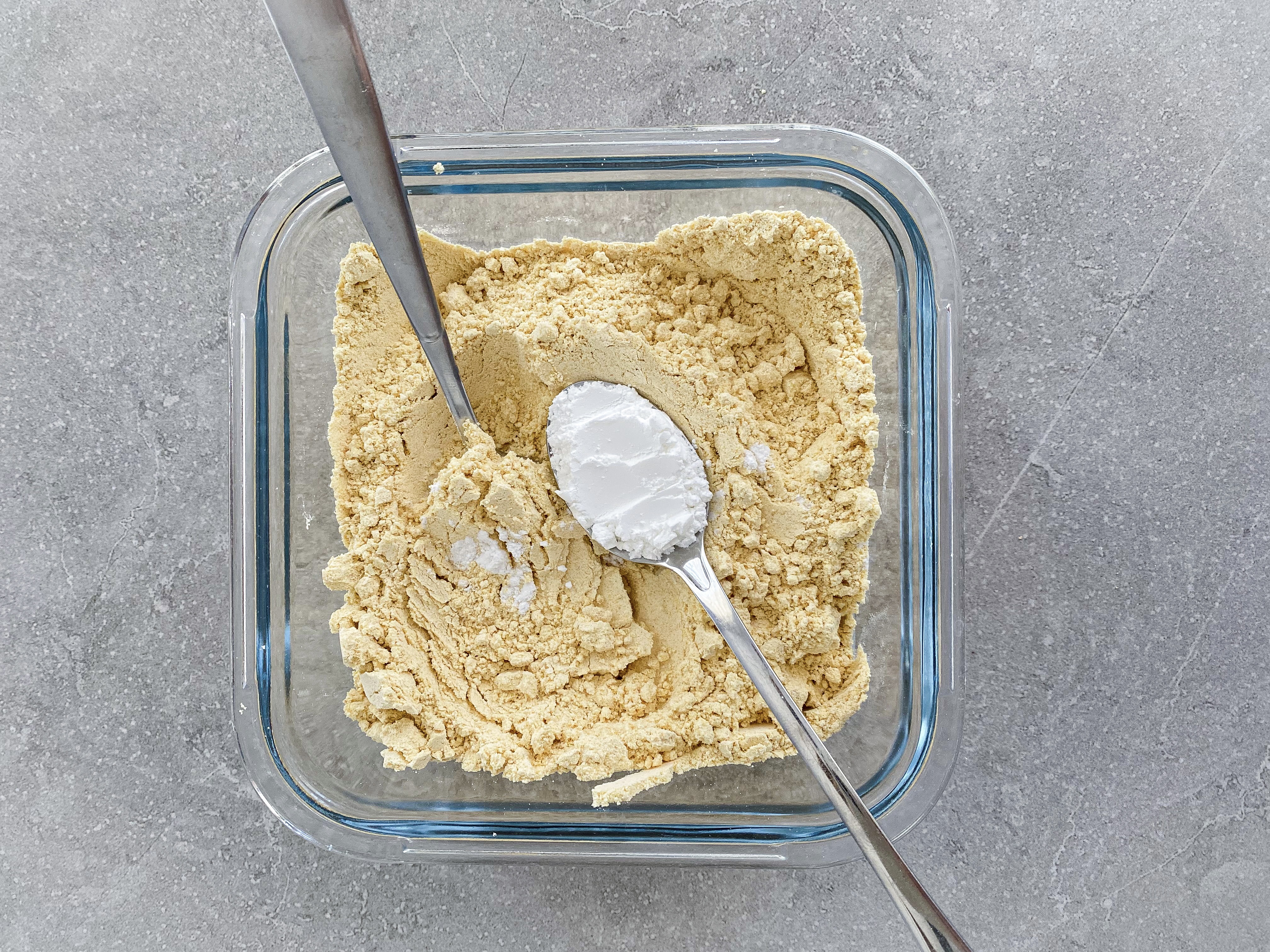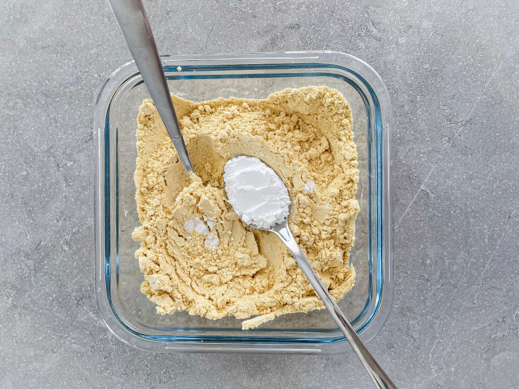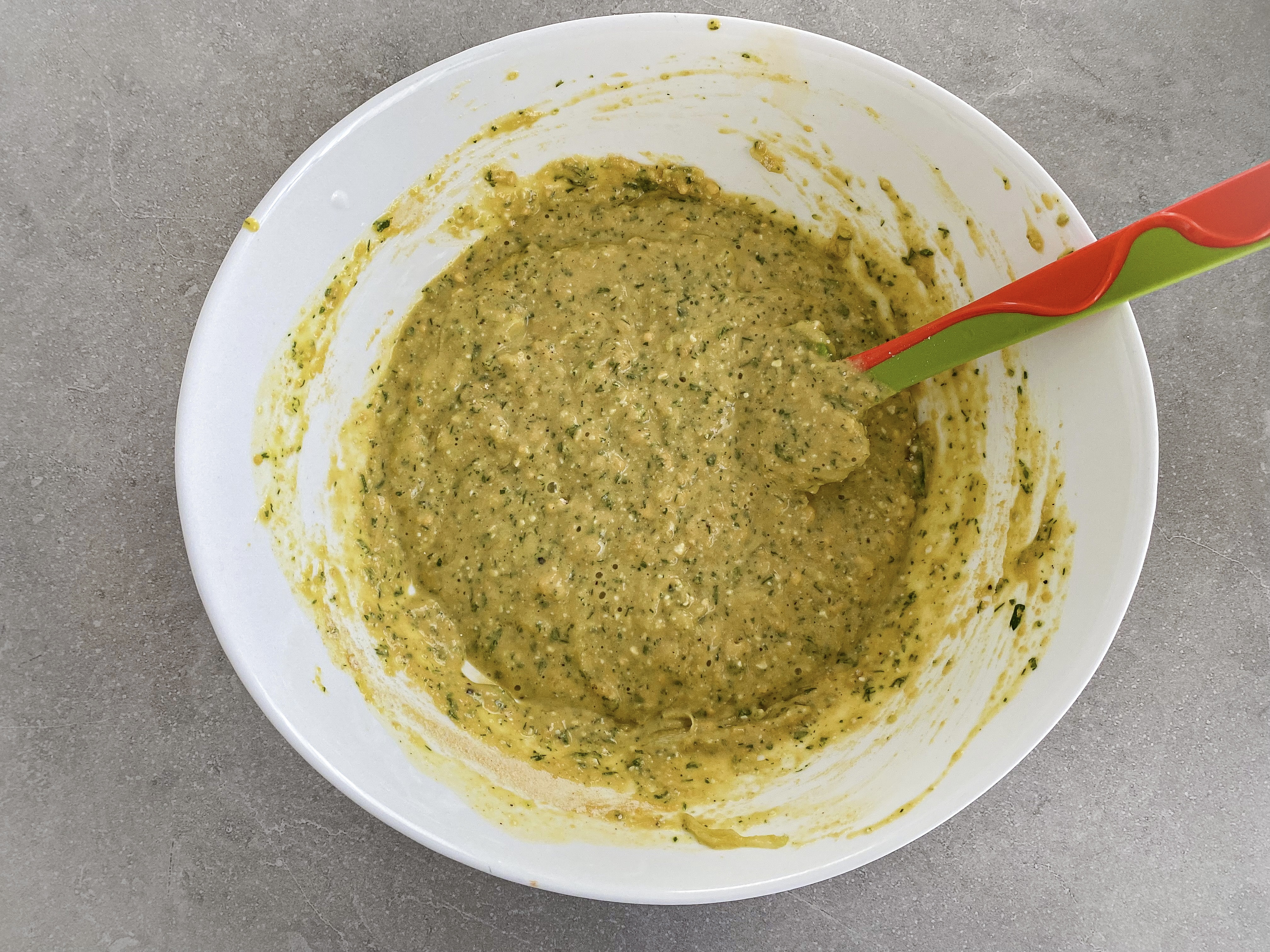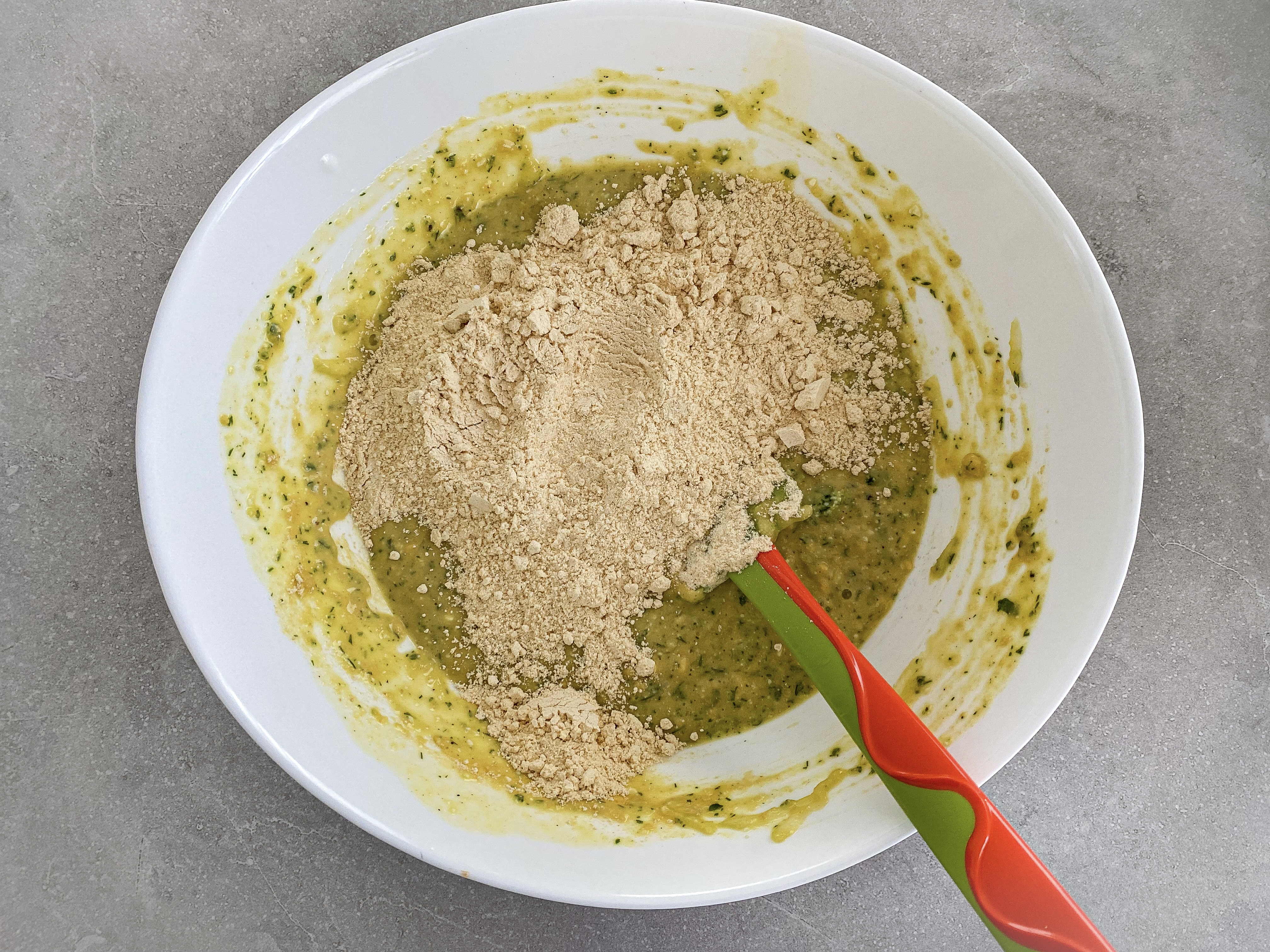2. Cât dovlecelul stă la odihnit, ne ocupăm de restul ingredientelor. Amestecăm făina de năut cu praful de copt.