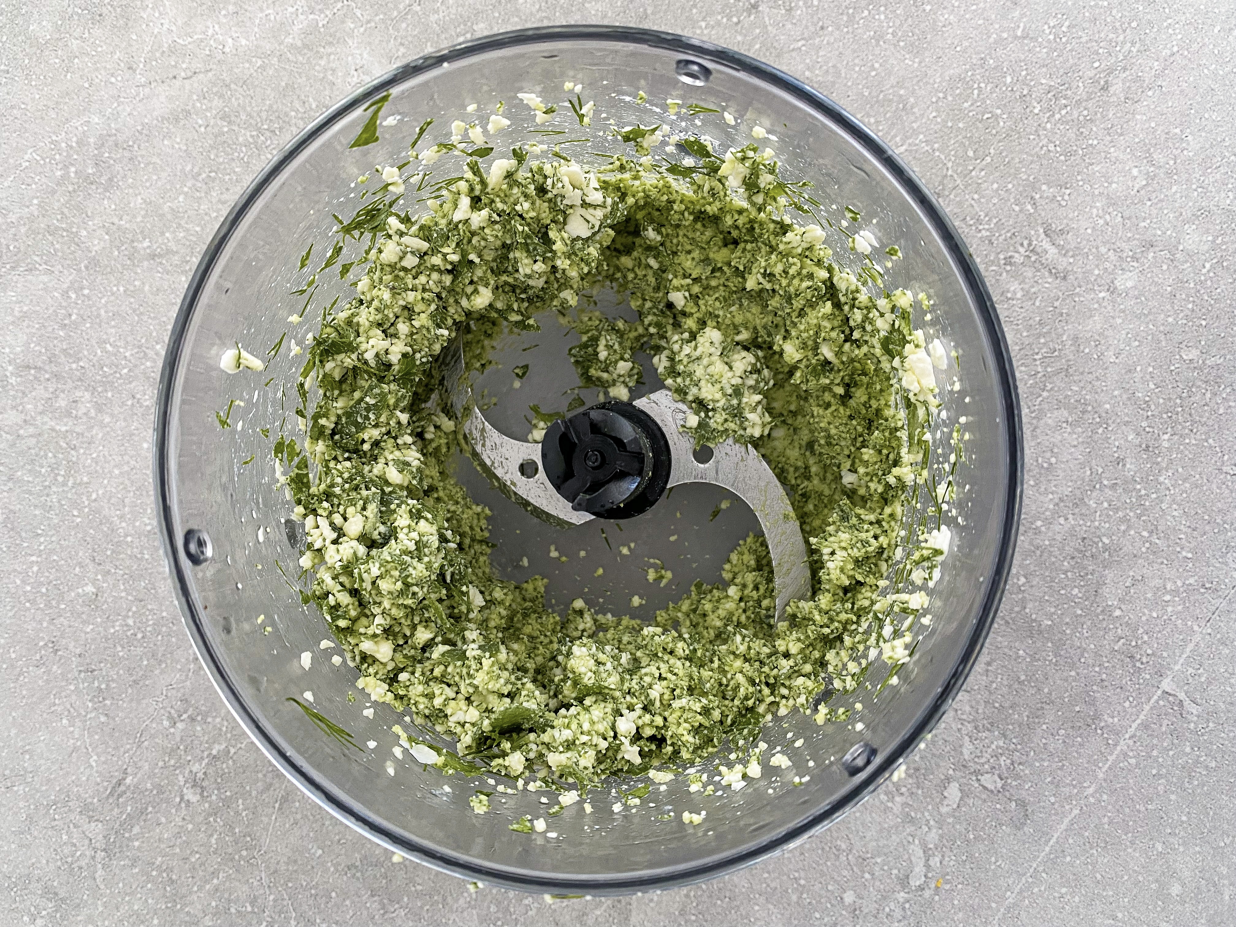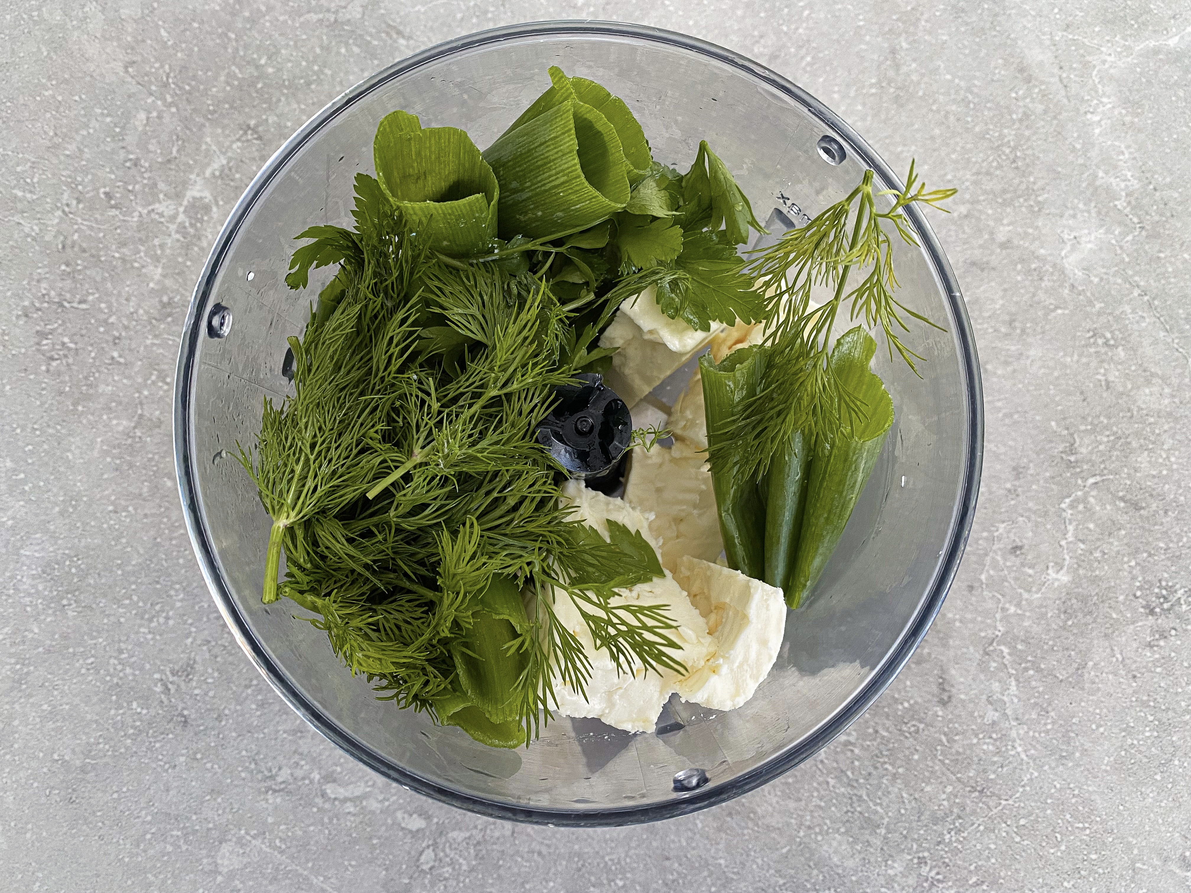 3. Într-un roboțel mic de bucătărie tocăm brânza, firele de ceapă verde, frunzele de mărar și cele de pătrunjel. puteti sa folositi si doar o legatura intreag ade marar, fara patrunjel. Dacă nu aveți roboțel, se poate folosi o răzătoare manuală și banalul cuțit.