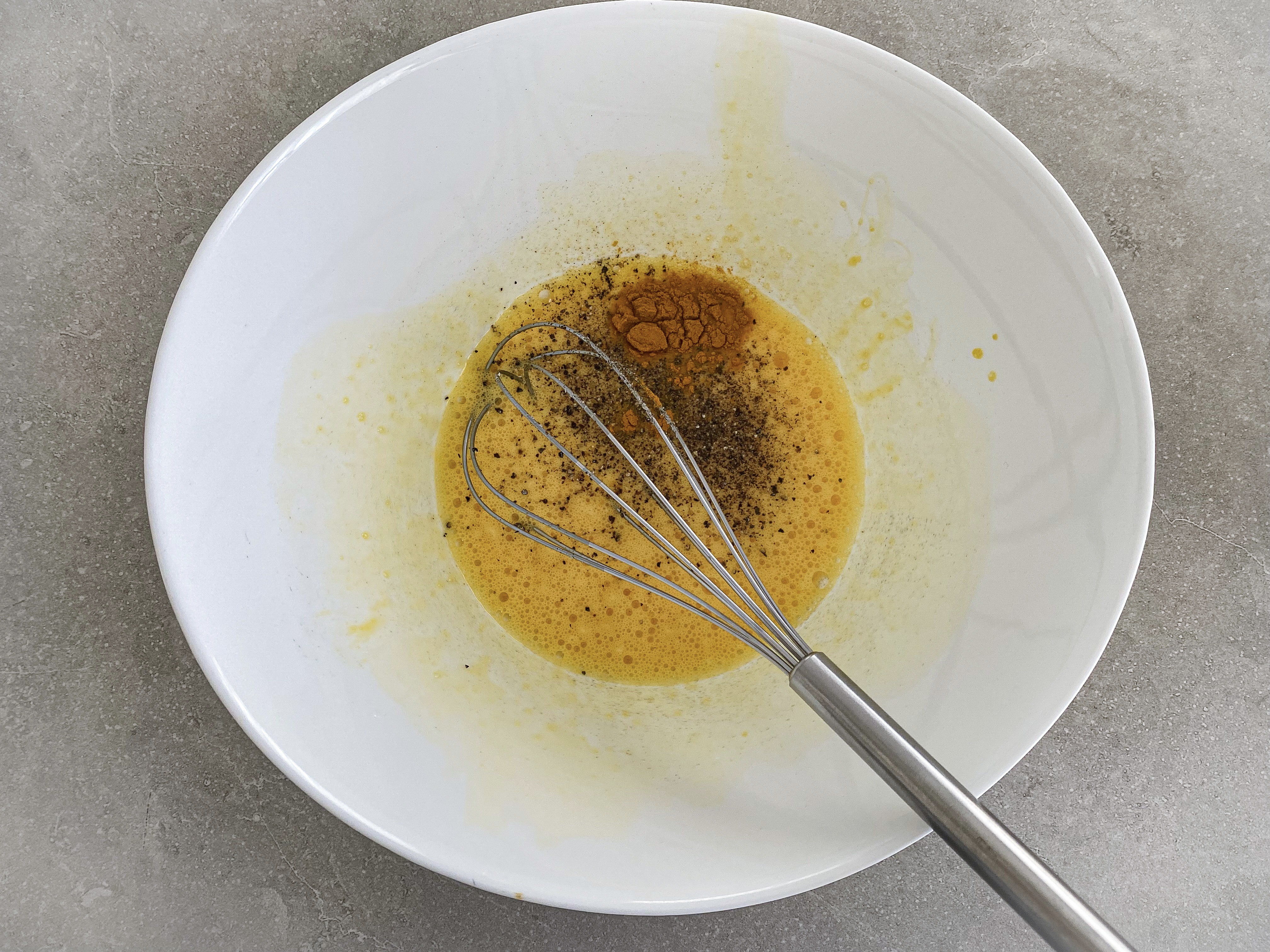4. Cu un tel batem cele trei ouă, adăugăm piper negru măcinat, turmeric și puțină sare. Cantitatea de sare depinde și de cât de sărată este telemeaua folosită de voi. Nu uitați că, deși am adăugat sare pe dovlecel, acesta a fost scurs și o parte s-a eliminat.