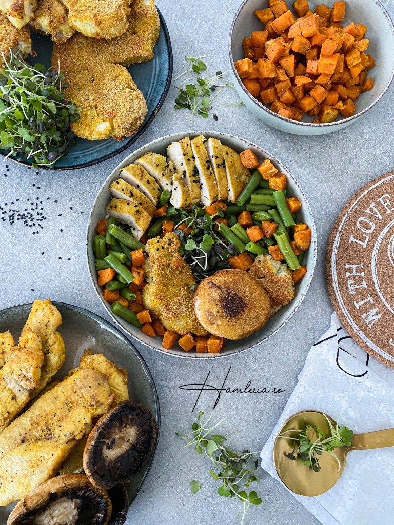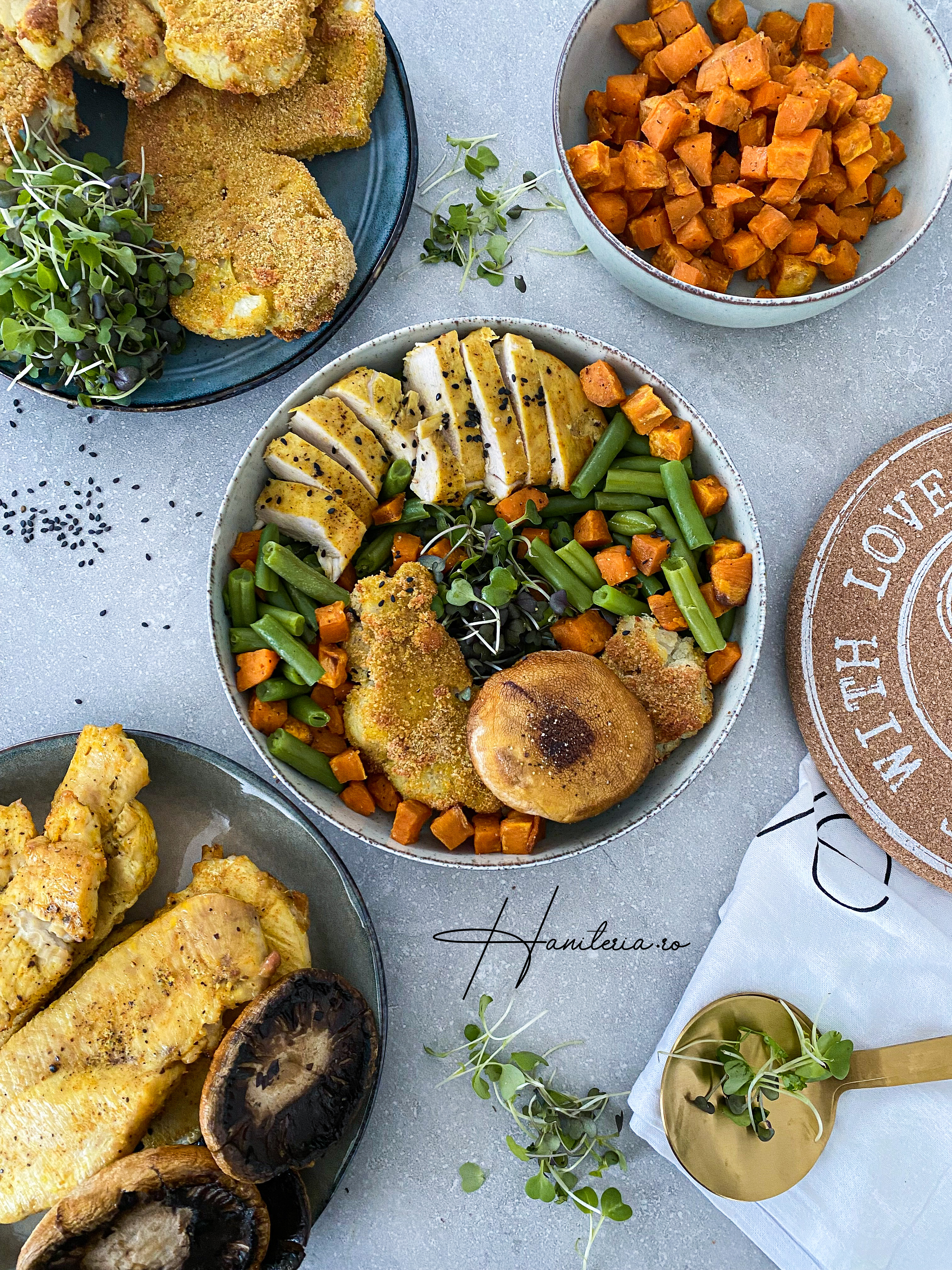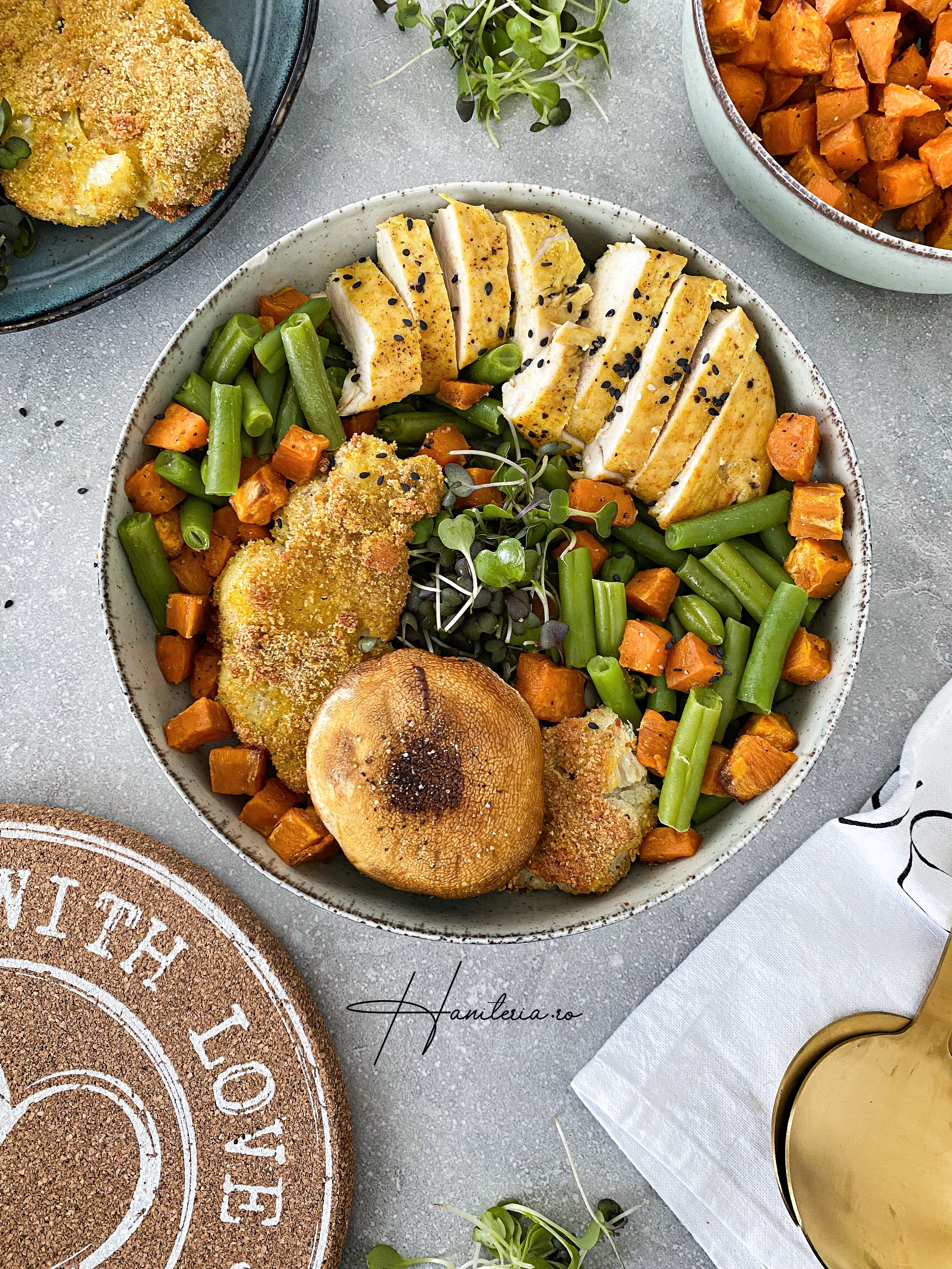 Toate alimentele pregătite astfel la cuptor, le pun în caserole și le folosesc următoarele zile în diverse variante. Astăzi am pregătit un bol mixt, cu o combinație între toate alimentele pregătite de noi. Evident, fiecare aliment poate să fie folosit și separat, în multe alte combinații delicioase.