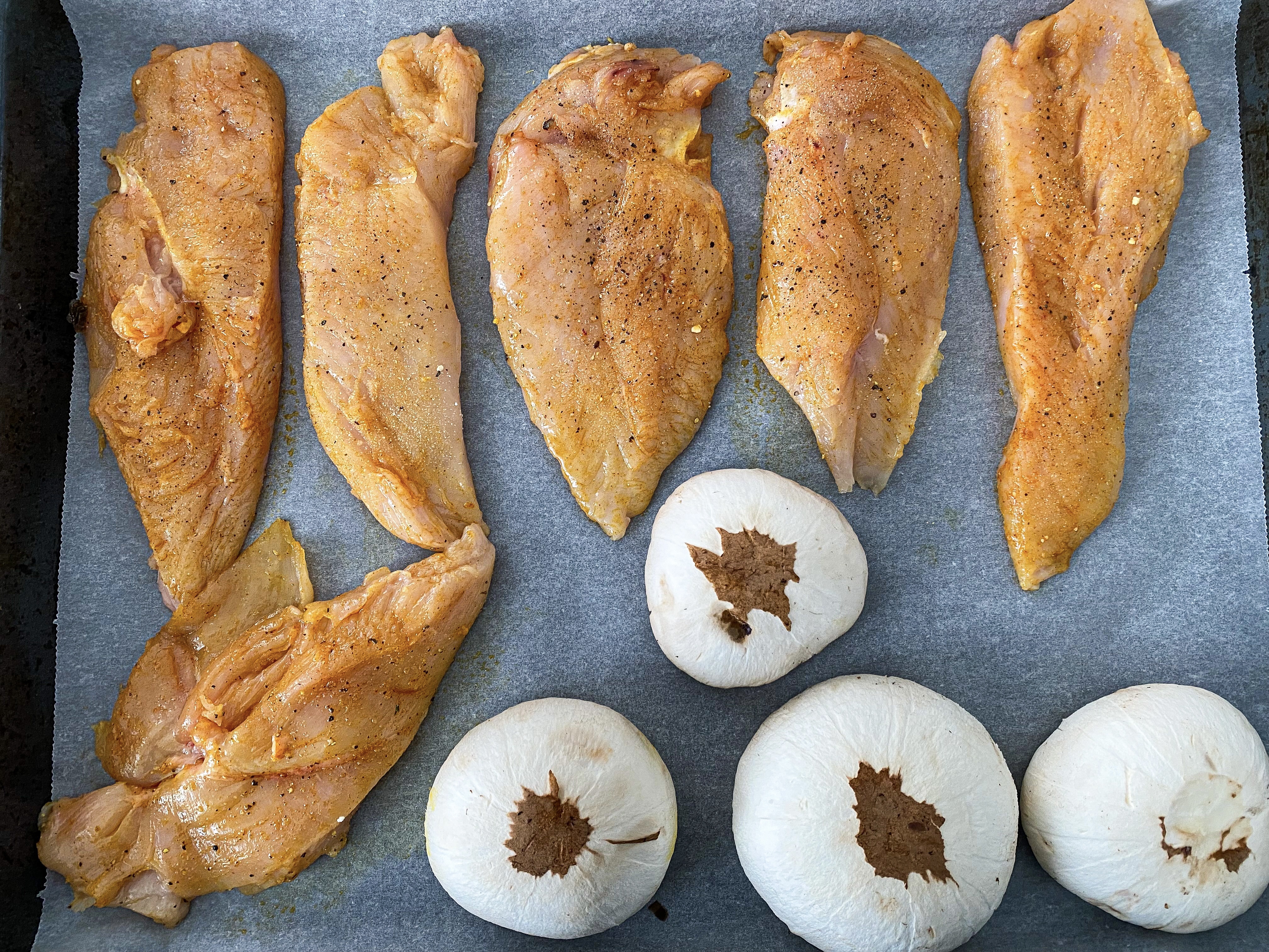 2. Curățăm ciupercile și le punem lângă pieptul de pui, cu partea unde a fost codița în jos. Eu le-am pus pe aceeași tavă, dar era de preferat să folosesc o tăviță suplimetară, deoarece ciupercile lasă cam multă apă. Ciupercile le curățăm fie cu o perie pe uscat, fie cu un șervet umed (nu le scufundăm în apă). Ca să meargă mai repede, eu le-am decojit pielea și le-am îndepărtat lamelele și codița de sub căciulie.
