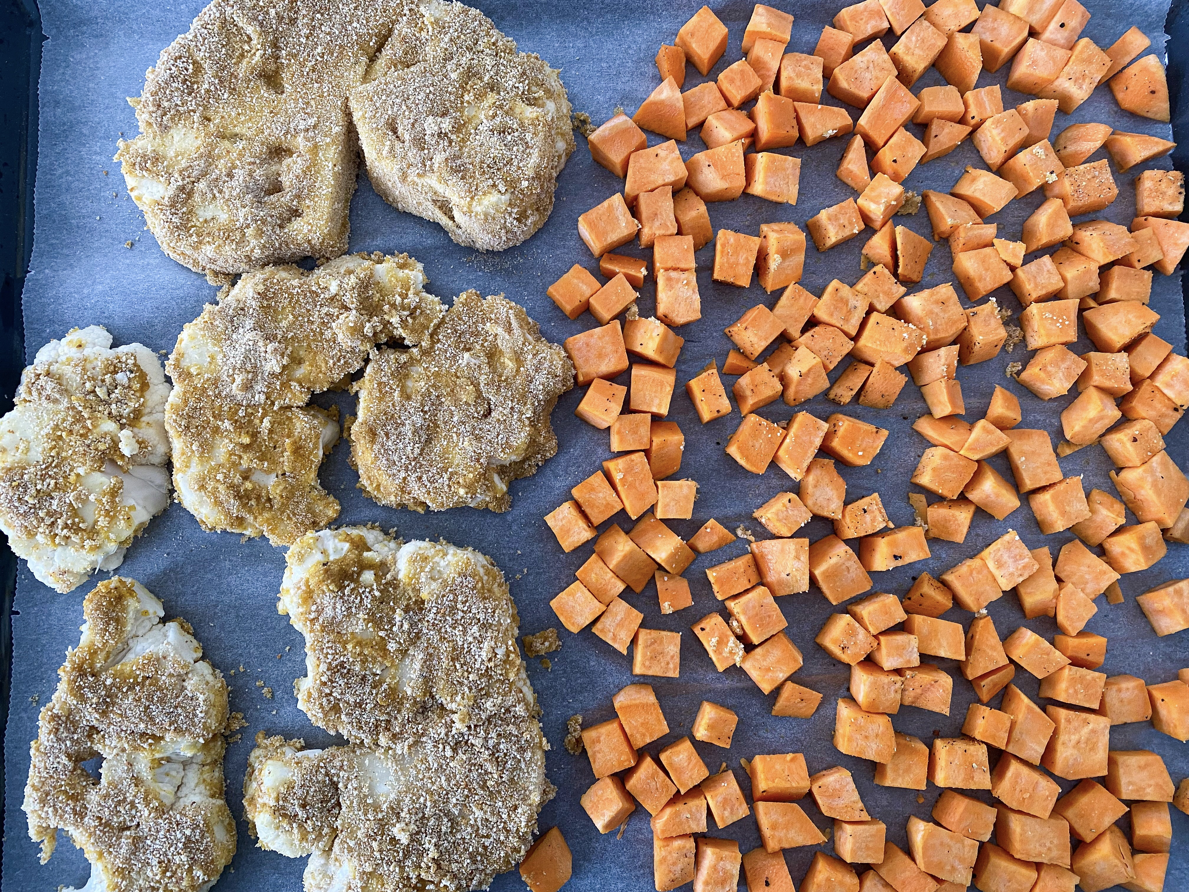 3. Am tăiat cartoful dulce cubulețe. Am pus o lingură de ulei plus condimente: sare, piper, usturoi granulat. Sare pun doar la final. Am așezat cartofii și feliile de conopidă pe o tavă tapetată cu hârtie de copt.