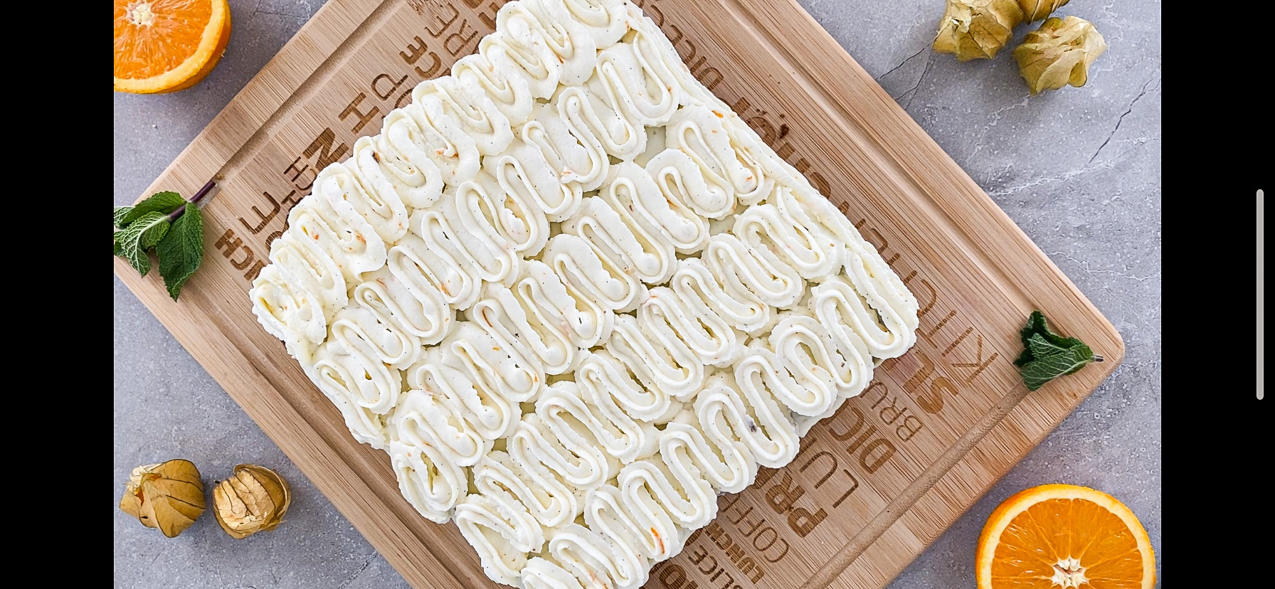 10. Am acoperit blatul răcit cu un strat subțire de cremă. Am pus restul cremei într-un poș și am decorat blatul cu un model oarecare. Am feliat prăjitura în bucăți mai mici dreptunghiulare. Am păstrat prăjitura într-un loc răcoros până când aromele s-au întrepătruns mai bine, după care am păstrat prăjitura la frigider.