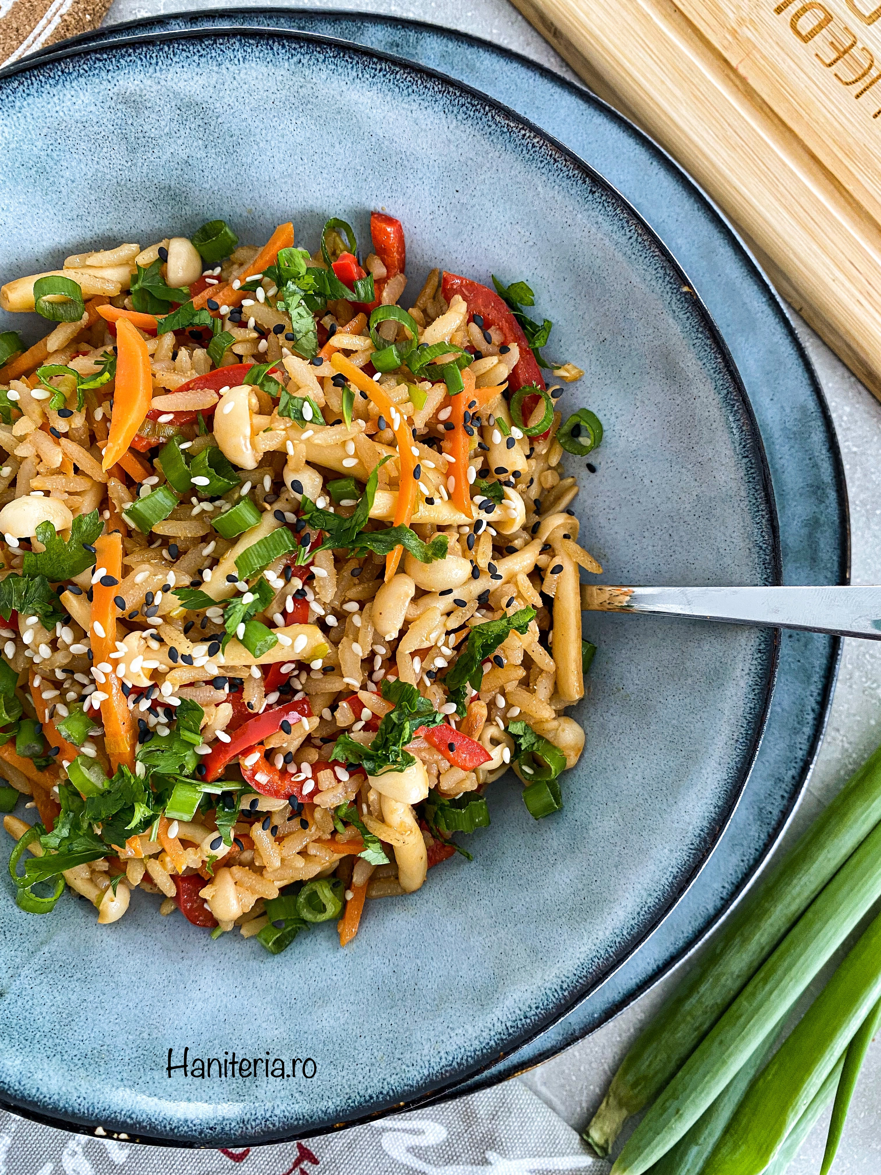 De cele mai multe ori îmi fierb mai mult orez integral, pe care îl pastrez la frigider pentru diferite combinatii în zilele ce urmează. Este numai bun pentru rețeta de azi, deoarece e recomandat să folosim un orez fiert cu o zi înainte sau măcar răcit câteva ore la frigider.
