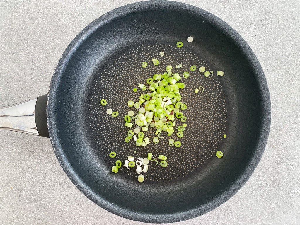 2. Într-o tigaie antiaderentă (eu azi nu am folosit un wok ci o tigaie clasică care a funcționat foarte bine) adăugăm cele două linguri de ulei și partea albă de la ceapa verde.