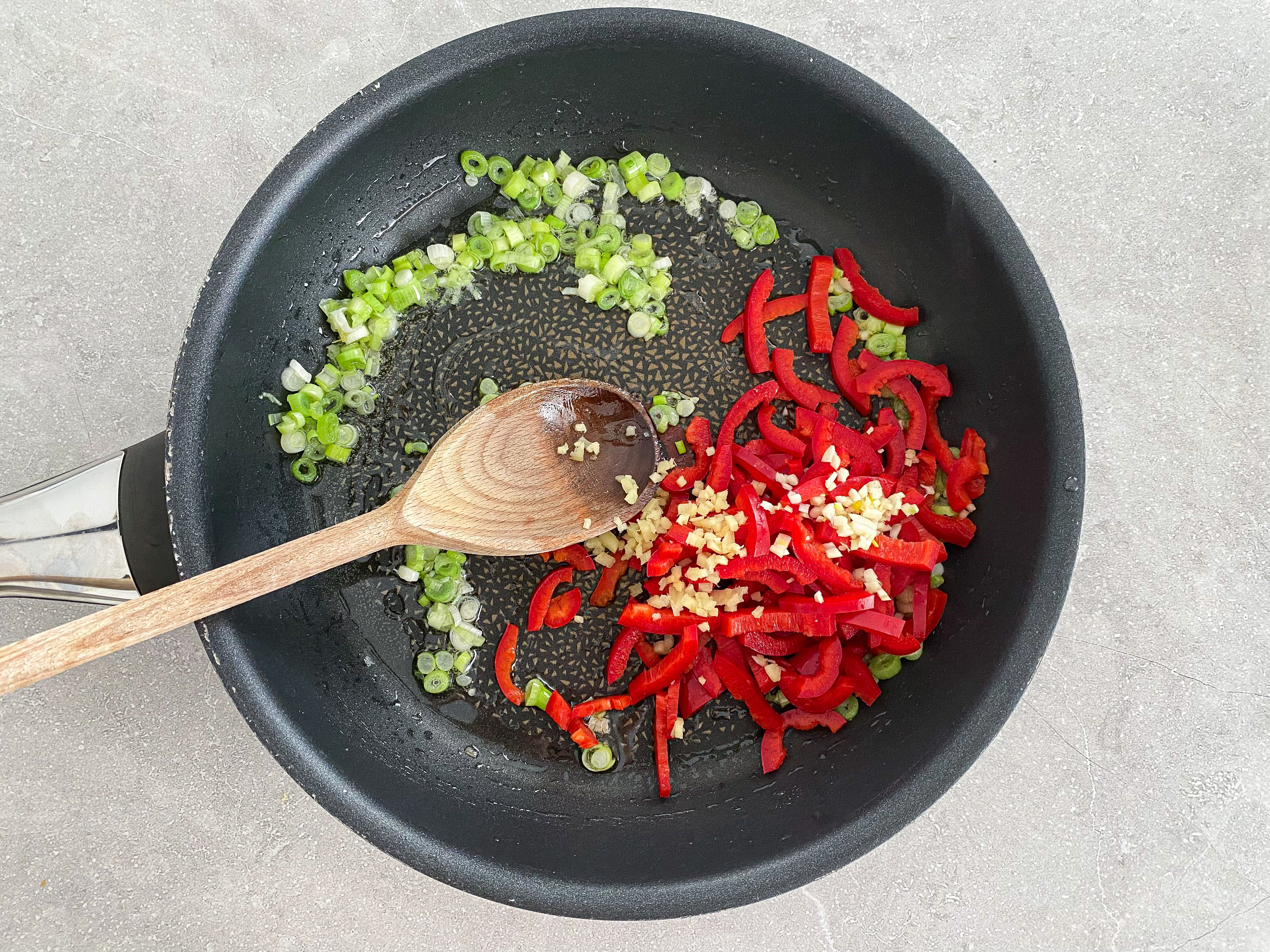 3. După 1-2 minute adăugăm și ardeiul tăiat feliuțe. Adăugăm și ghimbirul și usturoiul tocate mărunt. Continuăm să tragem legumele la tigaie, amestecând constant.