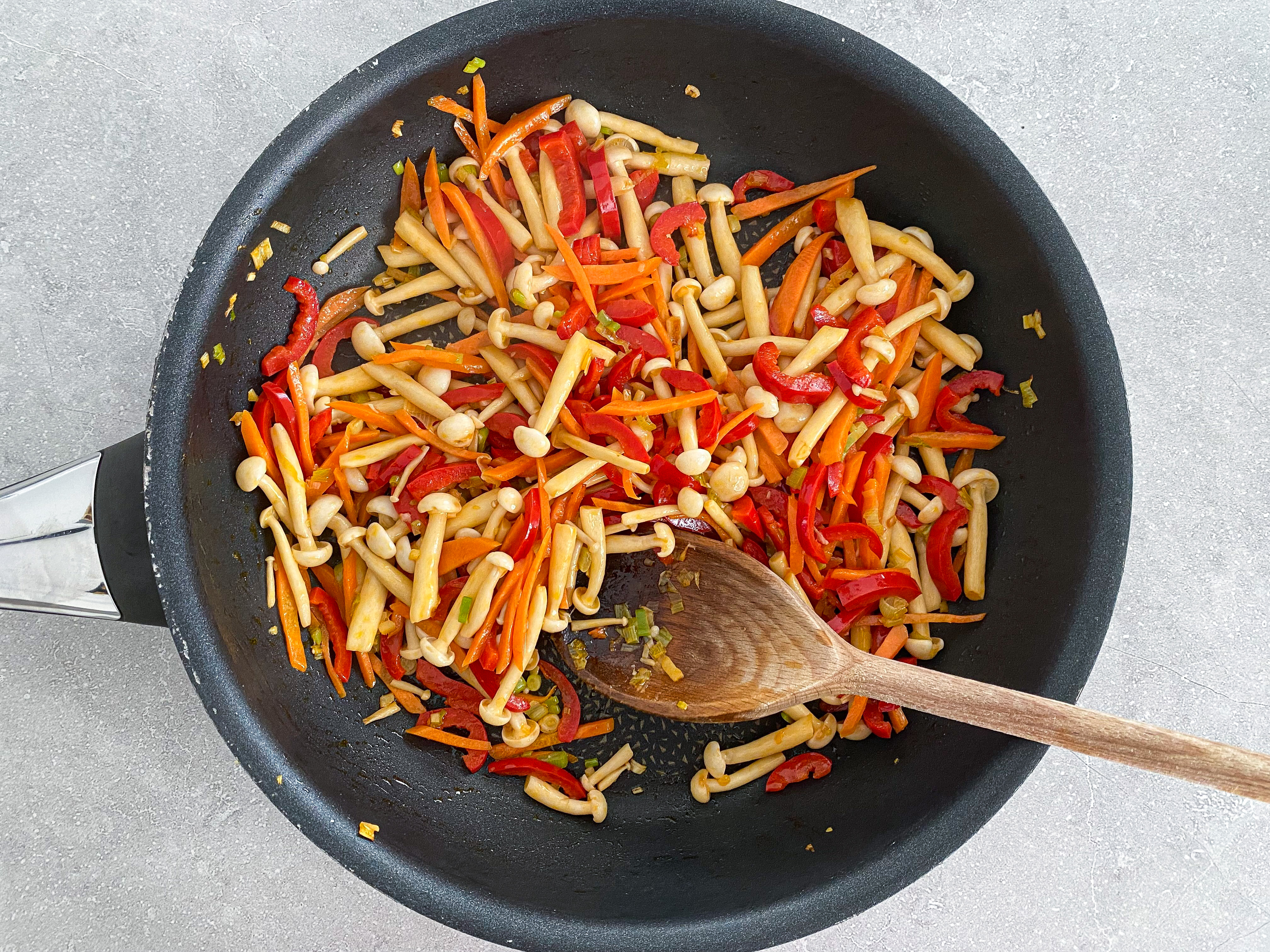 4. Adăugăm și ciupercile Shimeji și morcovul tăiat bețișoare. Continuăm să tragem legumele la tigaie, amestecând constant. Adăugăm sare și piper negru măcinat. Atenție la sare dacă folosiți sos de soia, deoarece aceste este deja sărat.