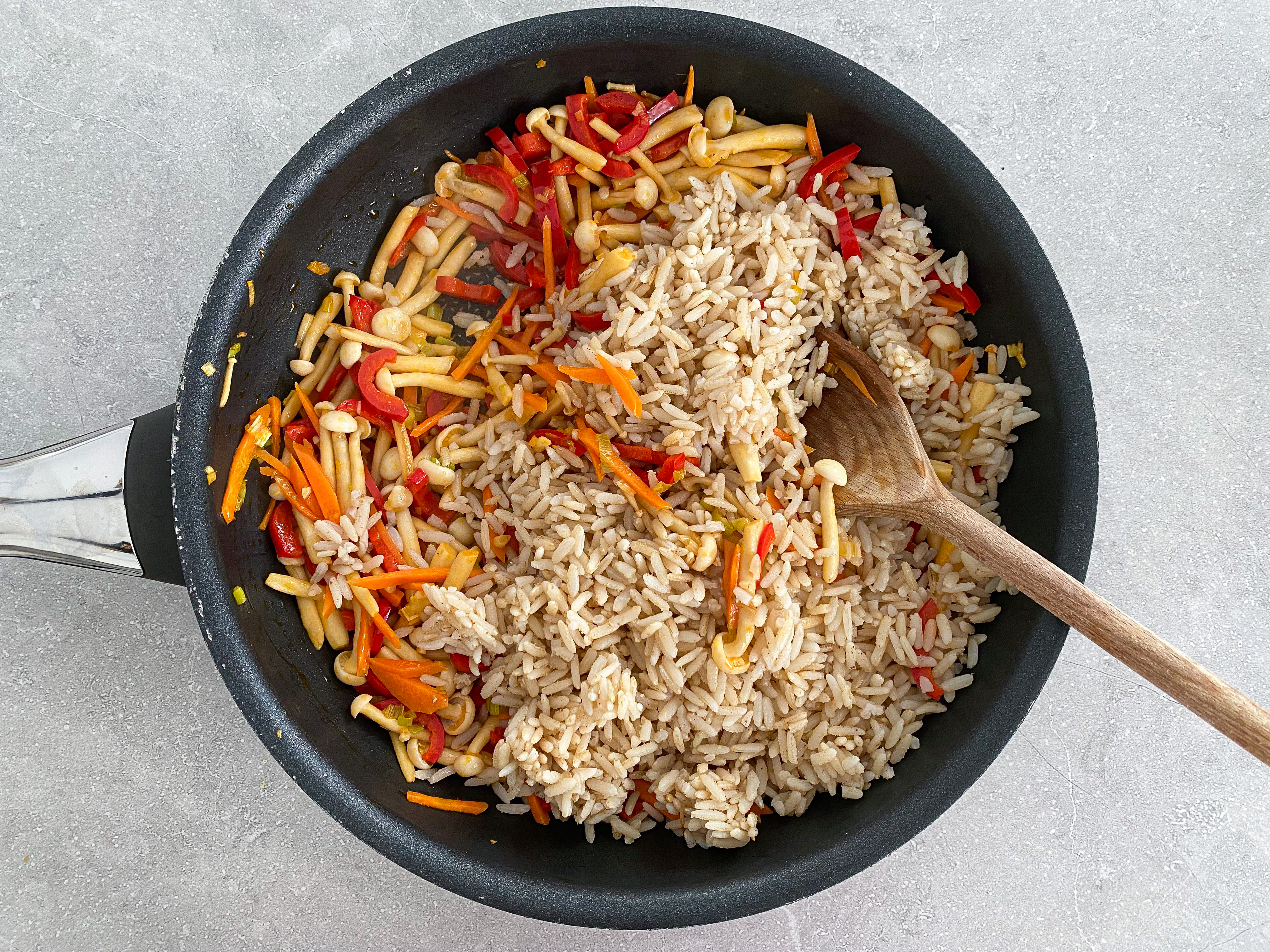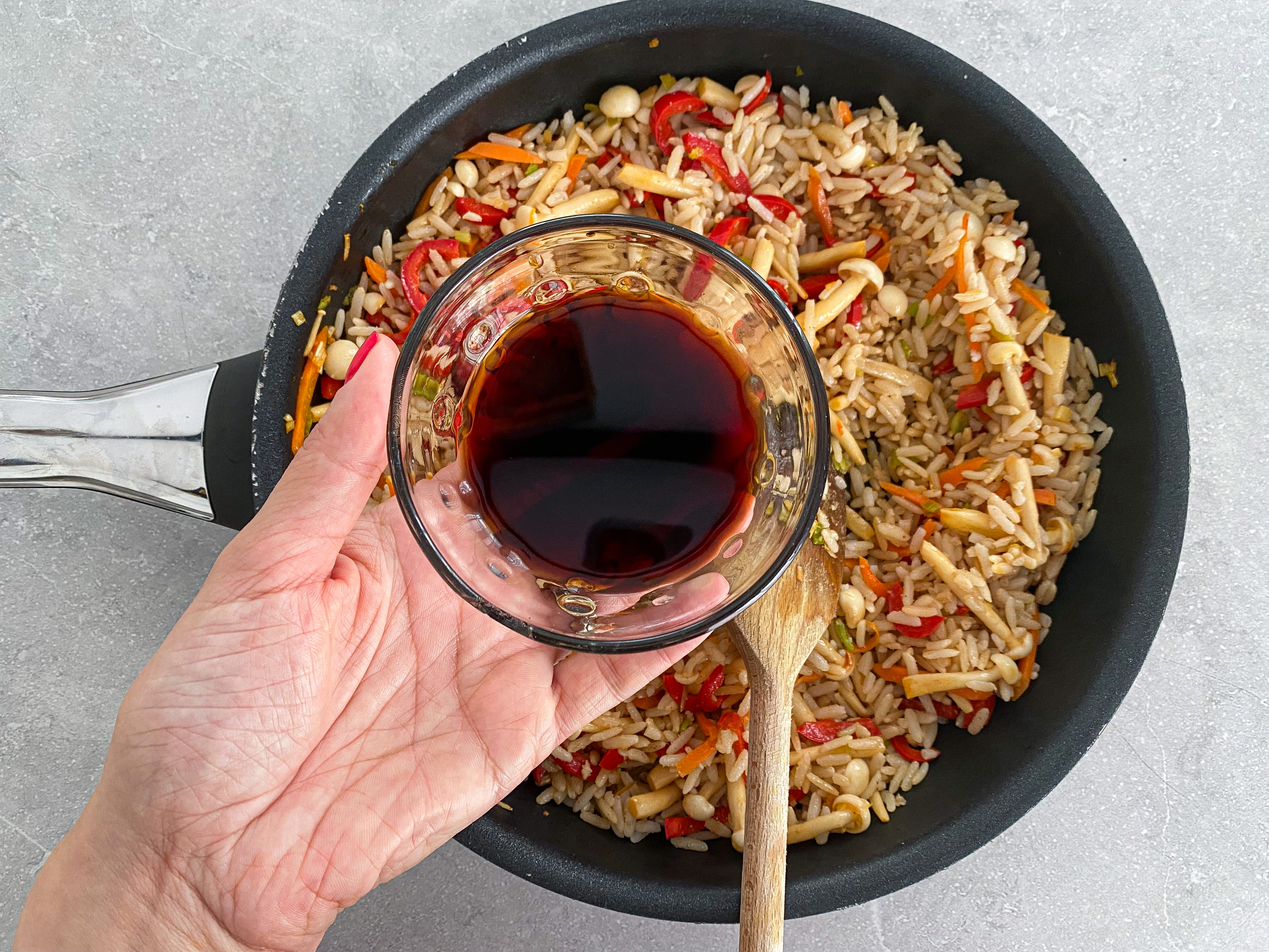 5. Când legumele sunt făcute (ele trebuie să rămână ușor crocante) adăugăm și orezul. Amestecăm sosul coconut aminos (sau sosul de soia dacă asta folosiți) cu oțetul de orez și le punem peste legume. Continuăm să prăjim totul până când orezul s-a încălzit.