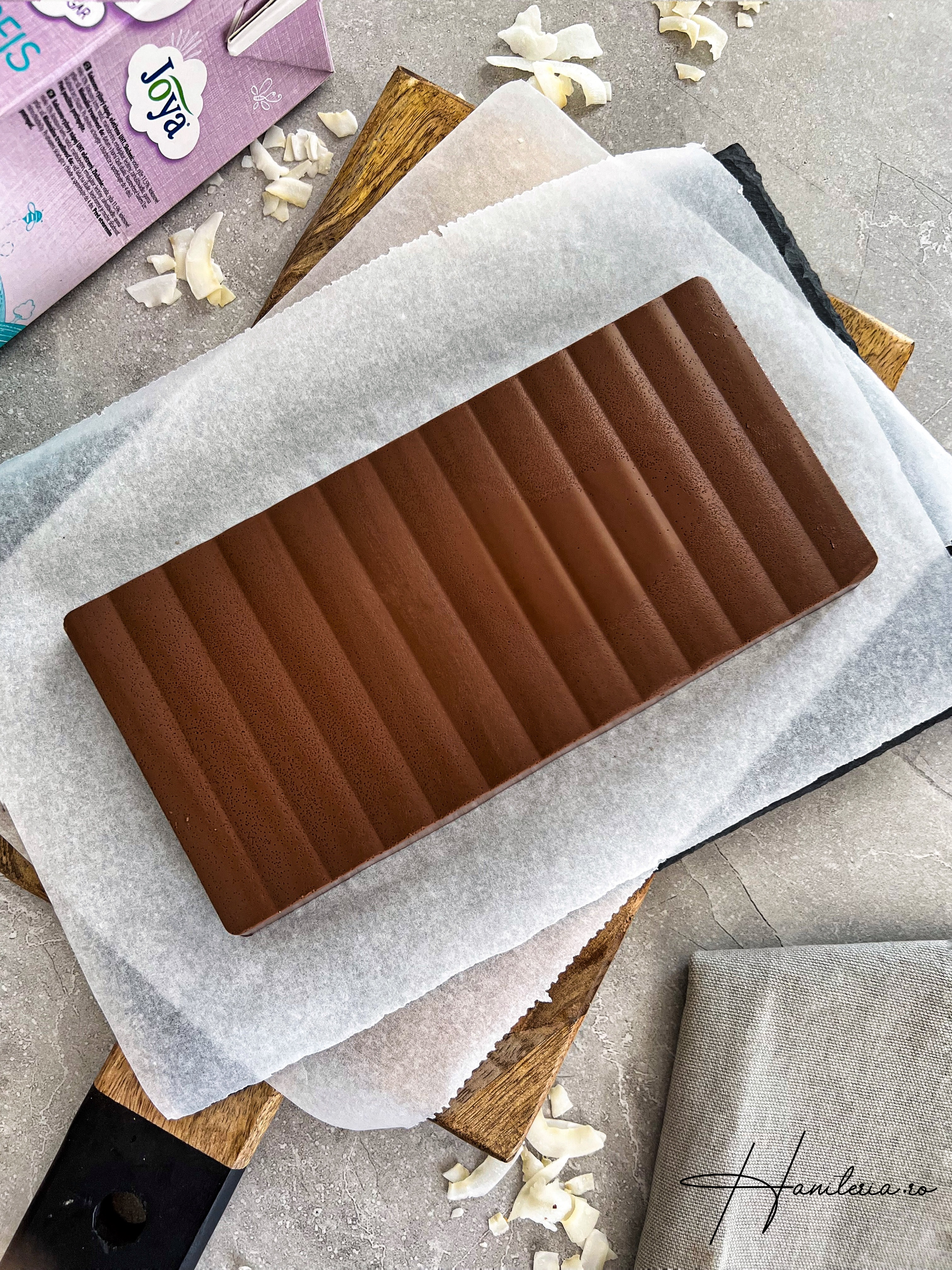 7. Scoatem cu grijă forma de ciocolată din tava de silicon. Am încălzit ușor marginile (cu puțină apă fierbinte) ca să imi fie mai ușor. Am tăiat desertul de ciocolată obținut în fâșii, pe măsură ce l-am servit.