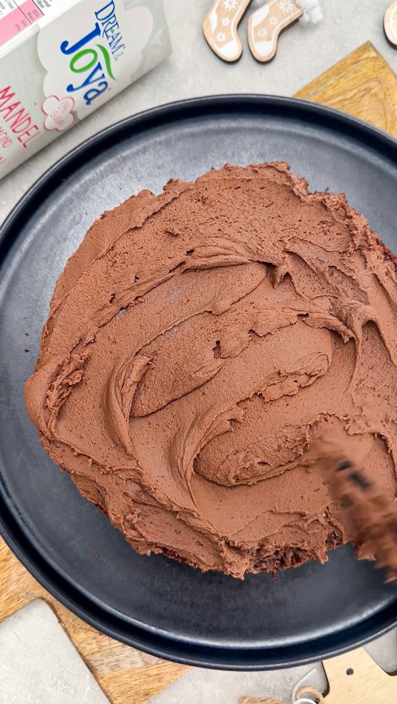 - Îmbacați tortul și pe margini cu puțină cremă de ciocolată. Opțional, puteți să îi faceți un model pe margini făcând niște valuri în ciocolată sau puteți să presărați chiar și puțină ciocolată rasă.