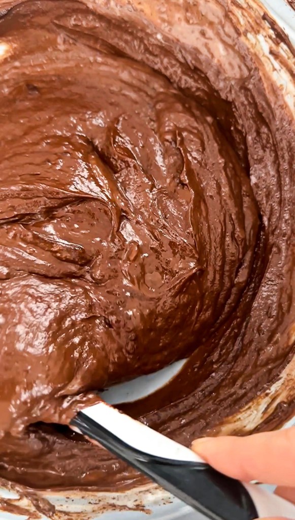Amestecați ingredientele uscate: făina, îndulcitorul, praful de copt și de cacao, bicarbonatul și sarea.